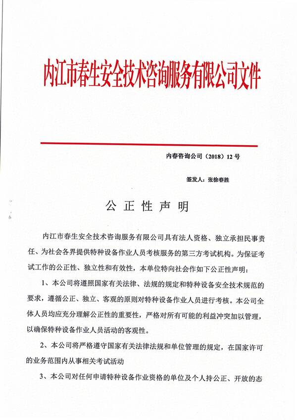 內(nèi)江春生安全技術(shù)咨詢服務(wù)公司公正性聲明