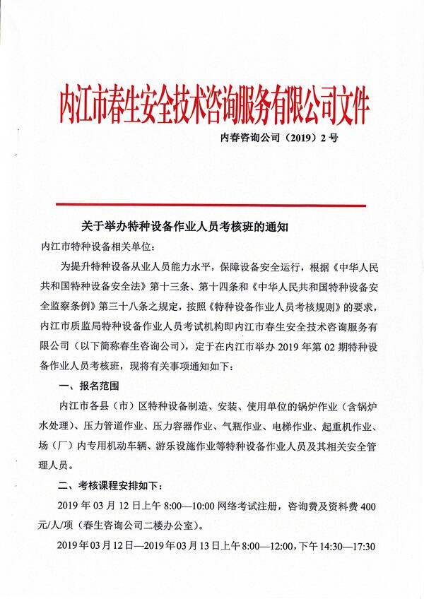2019年第二期特種設備作業(yè)人員考核培訓班的通知