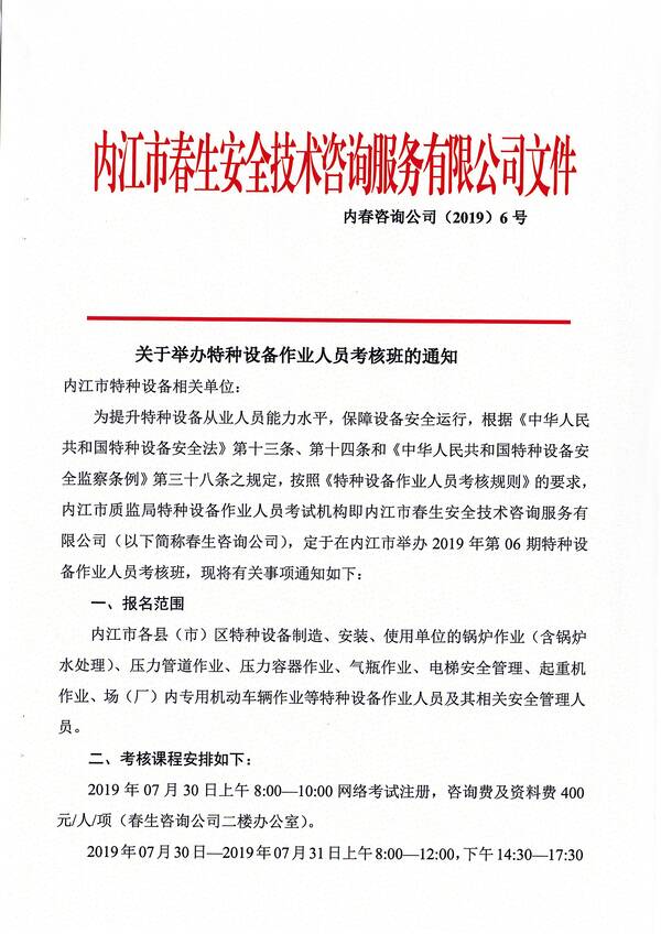 2019年第六期特種設(shè)備作業(yè)人員考核培訓(xùn)班的通知